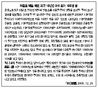 질환을 치료하기 위해서는 마음과 신체를 다스려야 한다. 환자의 상태를 키네시올로지(kinesioloy)로 파악하고 마음은 상담이나 심리요법으로, 신체는 서금요법(고려수지침)을 이용해 자극하고 있다. 본고에서는 서금요법·금경술 자극을 이용한 우울증 해소 사례를 소개한다. 현재 일본에는 10년 연속으로 자살자가 연간 3만 명으로 추산되고 있다. 자살자 중에는 정신질환뿐 아니라, 우울증 환자도 다수 포함돼 있다. 금년 5월에는 아래와 같은 신문기사가 실렸다. |