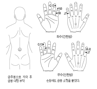 조모(여ㆍ78) 회원은 퇴행성 요통으로 고통을 겪고 있었다. 견딜 수 없을 정도로 허리가 아파서 3년 전부터 침도 맞아보고 병원도 다녀보고 좋다는 것은 이것저것 모두 해 봤지만 차도가 없었다. 요통이 너무 심해 일상생활은 물론 거동하기도 힘들어 남편이 식사 준비며 설거지까지 주방 일을 맡아 할 정도였다. 운기체형은 좌 목화불급, 우 화화태과였다. 음양맥진 결과 좌 부돌2성조맥, 우 부돌2성평맥으로 분별됐으며 맥박은 68박이었다. 치방은 먼저 허리의 통증이 극심한 곳을 금추봉으로 충분히 자극 후 대형 금봉을 부착하게 했다. 수지의 배면(손등) 상응부위를 금추봉으로 자극하고 금봉 소형을 부착했다. 좌수에는 기마크봉으로 간보(간한방 N3ㆍG13-보, N9ㆍJ7 -제)하고, 우수에는 기마크봉으로 신보(신한방 G13ㆍJ2-보, J7ㆍC7-제)했다. 이렇게 단 1회 치방으로 통증이 해소됐다. 이제는 허리에 통증이 느껴지지 않지만 조 회원은 예방 차원에서 금봉 대형 한 개를 허리에 붙이고 생활한다고 한다. 그리고 조금이라도 허리에 이상이 있을 것 같다고 느껴지면 두 개로 늘려 붙인다고 한다. 금봉 덕분에 허리가 통증 없이 시원하다며 조 회원은 금봉의 효능에 매우 만족해했다. |