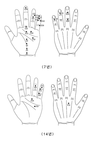 ■간암 투병 P선생이 지회를 처음 찾아온 것은 1994년 이었다. P선생은 서울 유명한 K의료원에서 “고향에 내려가서 주변 정리를 하셔야겠습니다”라는 사형 선고와 같은 담당의사의 소견을 듣고 착잡한 심정이었다. 그때 학회에서 서금요법을 배운 간호사가 고향에 내려가면 고려수지침학회 지회를 찾아가 의논해 보라고 해 우리 지회를 찾아오게 됐다. P선생은 간암으로 투병 중이었다. 우선 P선생에게 그동안 소식지에 실린 여러 사례를 보여주며 안심을 시키고 기맥과 상응점을 가르쳤다. 복진, 5운6기, 전자빔, 음양맥진 등을 종합해 우 양실증 좌 신실증으로 삼일체형을 판단하고 상응점(좌우 N18)과 대증방 A3ㆍ8ㆍ12ㆍ16, E38ㆍ42, F4ㆍ19, H2, I38, N1ㆍ3ㆍ5, G11에 자침을 하고 삼일체형에 따라 우 간승방ㆍ폐정방ㆍ위승방(대장승방), 좌 간승방ㆍ비정방ㆍ소장승방(위승방) 등을 바꿔가며 시술하게 했다. 상응점과 기맥보제를 서암봉ㆍ전자빔으로 더 보태 자극효과를 올리게 했으며 항암기에 필수적인 면역력을 높이기 위해 서암뜸의 여러 사례를 보여주며 강력히 권했다. |