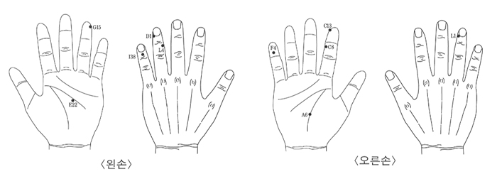치방은 좌 I38(은색), L4(금색) 기마크봉+E22 수지습부항+D1, G15 강자극+(좌수우측: 우 동일 자극)과 우 C8(은색), F4(금색) 기마크봉+A6 수지습부항+C13, L1강자극을 줬다. 우측 증상이 심해 우측 중심으로 집중 자극을 했다. 우수 제4지에 구암특제반지를 끼고, 우측 팔목에 금경팔찌를 착용하도록 했다. 20여 일이 지난 후 동생에게 언니의 손가락 저림 증상에 금경팔찌 효과가 있더냐고 물어보니 “우리 언니 팔다리 마비 증상까지 거의 다 해소돼서 너무 좋아요”라고 말했다. 이에 나는 “무슨 말이냐? 팔다리 마비 이야기는 없지 않았느냐?”고 반문했다. 그녀의 언니는 우측 팔다리, 손가락까지 저리다 못해 마비증상까지 겪으면서 이러다가 중풍 맞으면 어쩌나 하는 생각 때문에 늘 불안해 해왔다. 그러던 중에 서금요법으로 건강관리를 잘 하고 있는 여동생의 권유로 함께 선릉지회를 방문했으나, 심각한 마비증상은 동생이 걱정할까 봐 말을 못 했다는 것이다. 참으로 짧은 기간, 서금요법 좋은 효과를 본 사례라고 하겠다. |