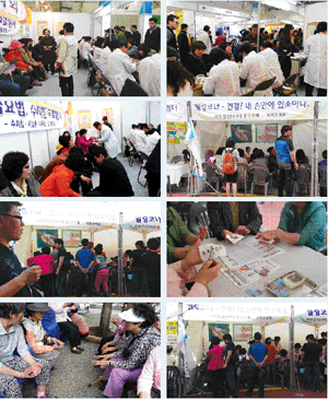이날 ‘사하수지회’ 봉사부스는 행사장 입구의 본부석과 사하보건소 부스의 옆 자리에 나란히 힐링 코너에 배치받았다. 3일간 약 500여 명의 방문객이 수지침부스를 찾아 행사 관계자들로부터 관심을 끌었으며, 봉사단은 방문객들에게 고려수지침·서금요법의 자극 체험을 하는데 최고의 봉사활동을 펼쳤다. 40대 한 남성은 항강증으로 고생하고 있었는데 통증클리닉을 가도 소용이 없고 최근에는 잠을 못 이룰 정도로 괴롭다고 호소를 했다. 봉사단원이 중지의 상응점 I5·6번 지점에서 뚜렷하게 압통점이 나타나 압진봉(PEM)으로 자극을 주자 “상응부위는 너무 아픈데 기분좋게 바로 뒷목이 시원해진다”고 말했다. 또 한 30대 중반의 남성은 자신은 건강에 아무문제가 없는데 같이 온 부인이 소화가 안되니 부인을 소화가 좀 잘되게 해달라고 간청을 했다. 봉사단원이 부인을 기본방에 서금요법(특상 황토서암뜸)을 뜨게 하는 동안 남편의 음양맥상을 보니 좌측이 부돌2성평맥으로 나타나 본인도 맥을 짚어보게 한 다음, 수지침으로 E8제(制)하고 I2를 보(補)하니 평인지맥으로 됐다. 봉사단원이 다시 본인에게 확인시켜주니 정말로 기쁘다고 감탄을 했다. 이번 행사 이후 수요일마다 정기적으로 봉사하는 ‘장림 사하봉사센터’에 고려수지침 자원봉사 소문을 듣고 찾아오는 수혜자가 부쩍 늘어 회원들은 힘들지만 뿌듯한 마음으로 오늘도 열심히 봉사에 최선을 다하고 있다. 김채년 지회장은 “고려수지침 자원봉사 활동은 대법원 판례에 따른 정당한 봉사활동이며 한의계의 지속적인 방해 활동은 즉각 중단돼야 한다”고 고려수지침 자원봉사활동의 정당성을 설명했다. |
