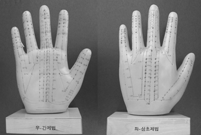 ■눈 뻑뻑한 증상 손모형에 기감봉 자극으로 싹~ 김모(40대 중반·여) 회원은 멀리 평택에서부터 맥진 수업을 들으러 오는 회원이다. 심신이 약했던 김 회원은 서금요법을 이용해 건강을 관리하게 되면서 염파요법을 본인이 직접 해 보고자 하는 욕구가 생기게 됐다. 집이 멀었지만 수업 시간보다 보통 20~30분 일찍와서 필자에게 맥진을 한 후 기마크봉 등으로 자극을 주고 수업을 시작하곤 했는데, 그날은 맥진 후(우 간승, 좌 삼초승) 손모형도에 기감봉을 이용해 우측은 간제법, 좌측은 삼초제법으로 자극을 주자 바로 평인지맥이 되면서 뻑뻑했던 눈이 맑아짐을 느낄 수 있었다고 한다. 그래서 요즘은 수업 시간은 물론이고 집에서도 본인과 가족의 건강을 위해 손모형도와 사이버수지침을 이용해 염파요법으로 자극을 하곤 한다. <우간제법><좌삼초제법> |